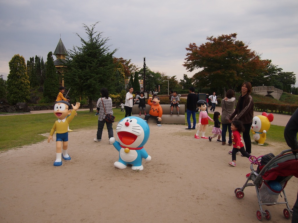 高岡市おとぎの森公園という大きな公園には、ドラえもんの空き地を再現したスペースがあり、各キャラクターの像がポコポコとたてられています。