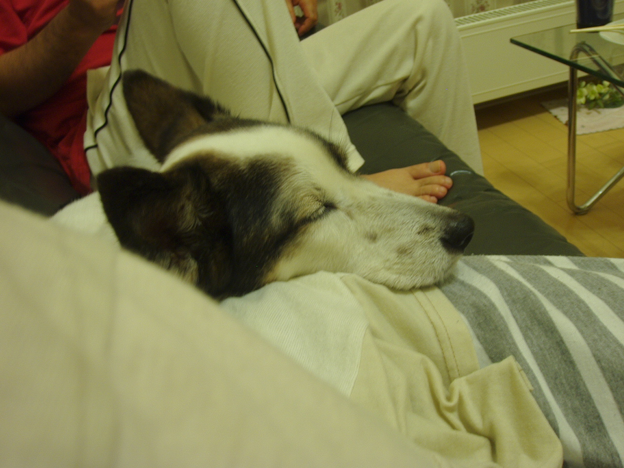 私の腰にアゴを置いて寝ているハイジ・・・かわいいけど噛みつくぜ!