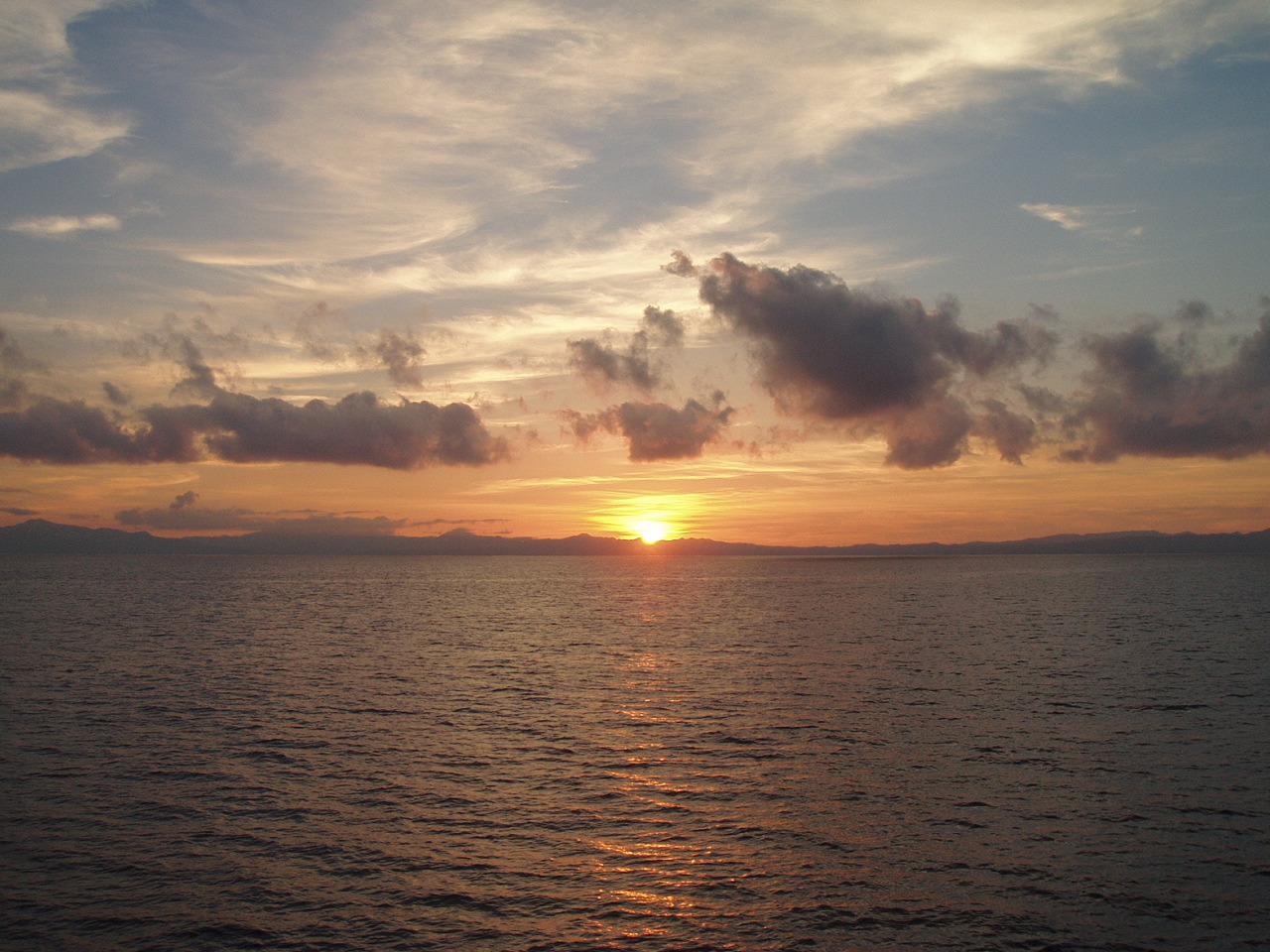 写真はフェリーからの夕日。