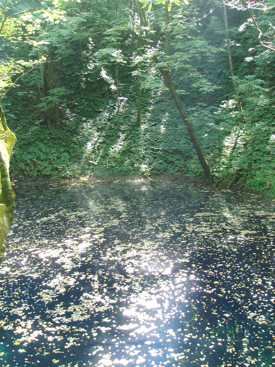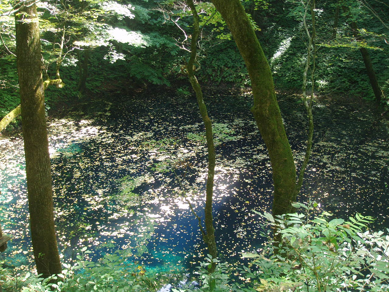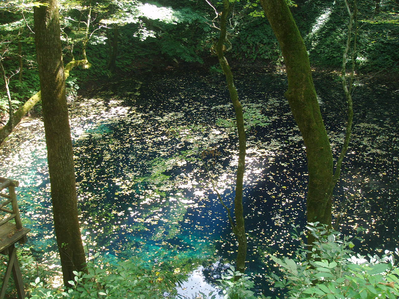 水面に浮かぶ枯葉が日光を反射して、はじめは青く見えなかったのですが、上の方から見るととても青く美しい水。