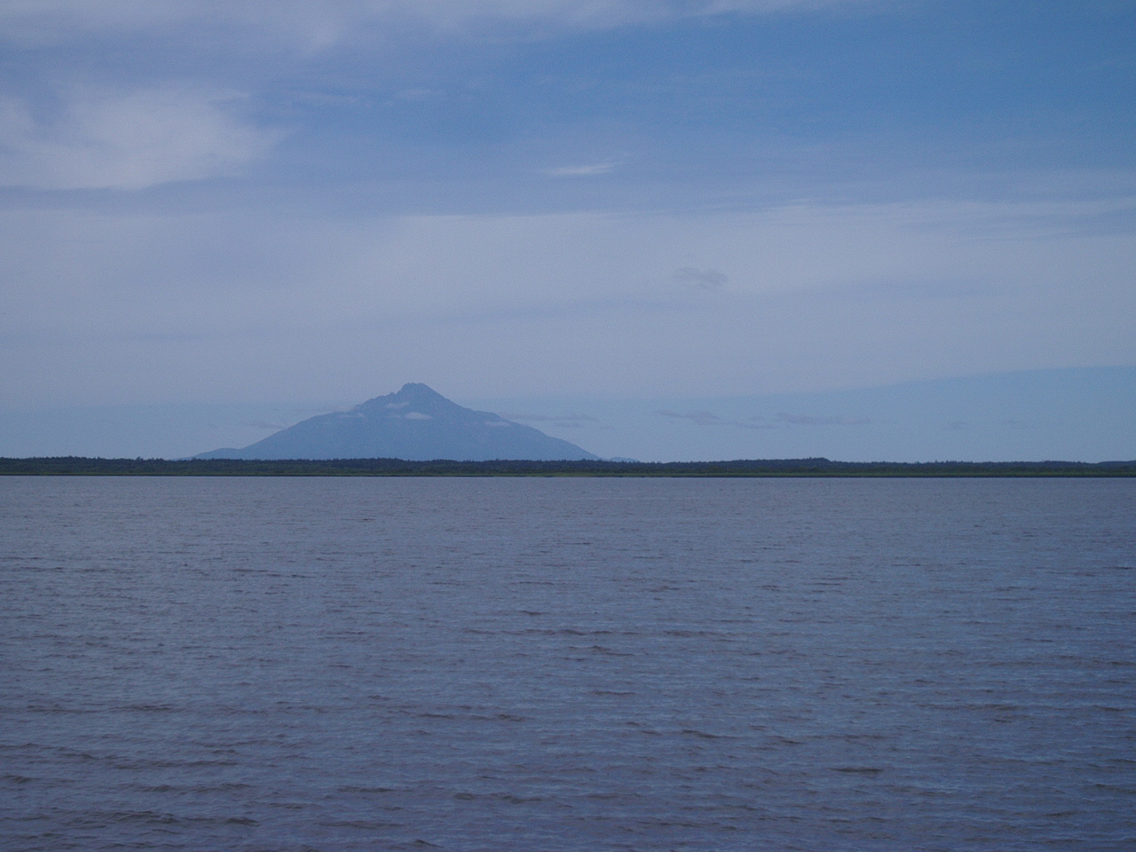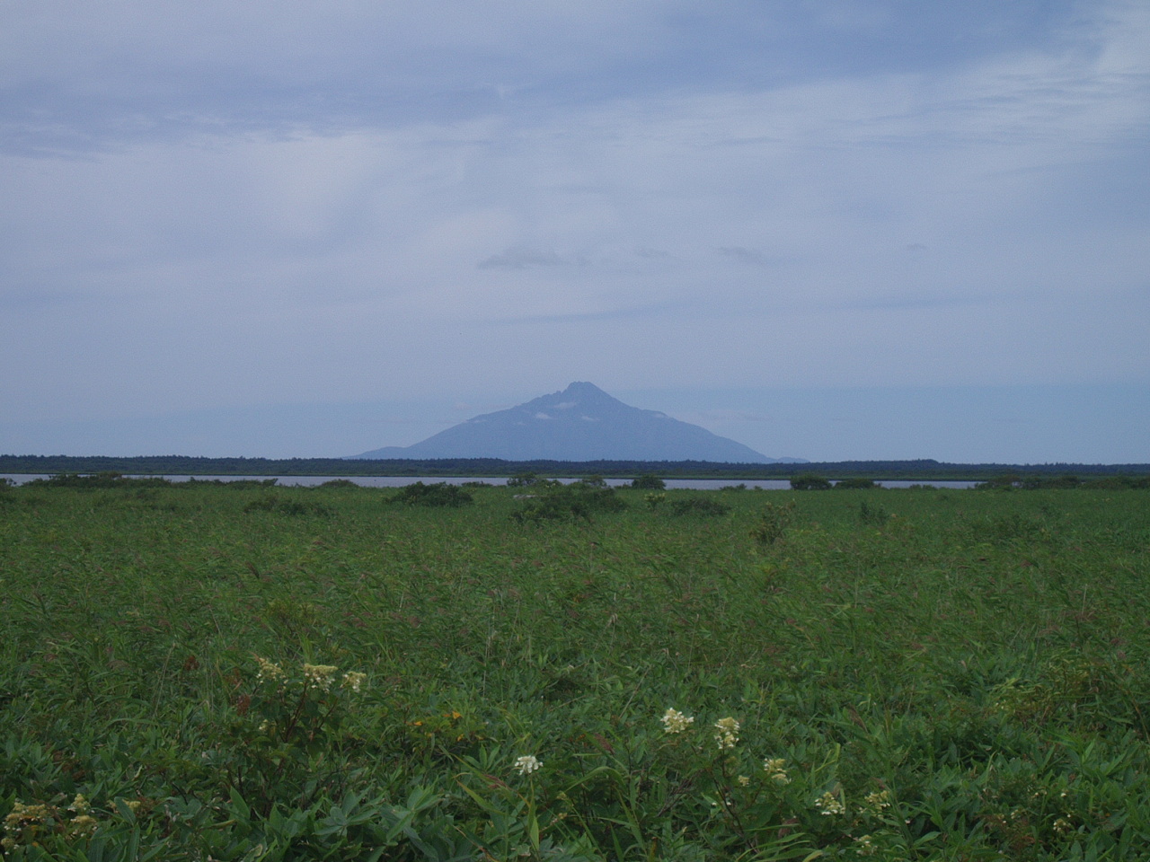 沼の向こうに見える山は、海を挟んで向こう側にある利尻島の利尻山。