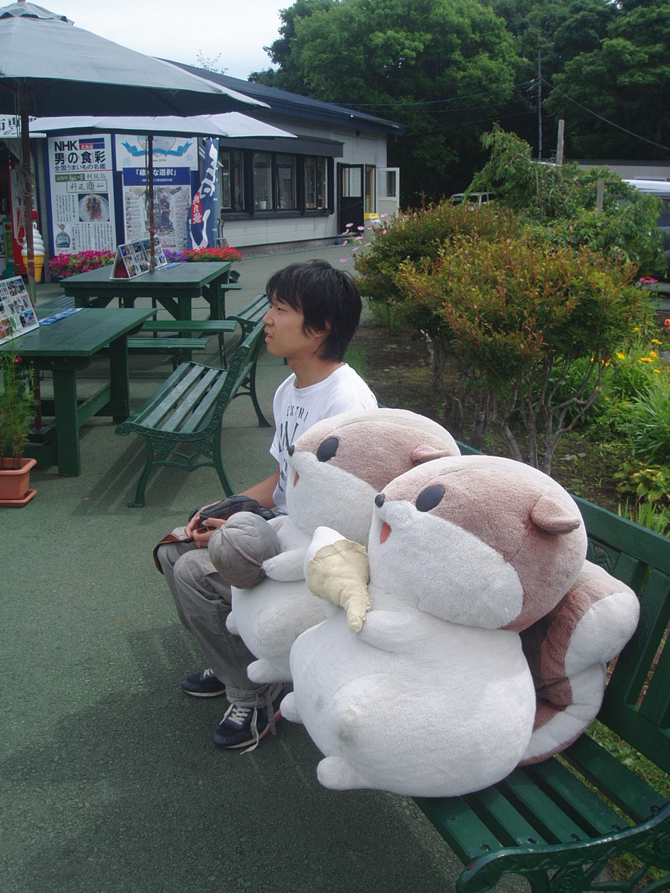 湖のほとりの道の駅では、町おこしの一環で無料記念写真を撮ってくれると言われ、とても恥ずかしい記念写真を撮ってもらいました。